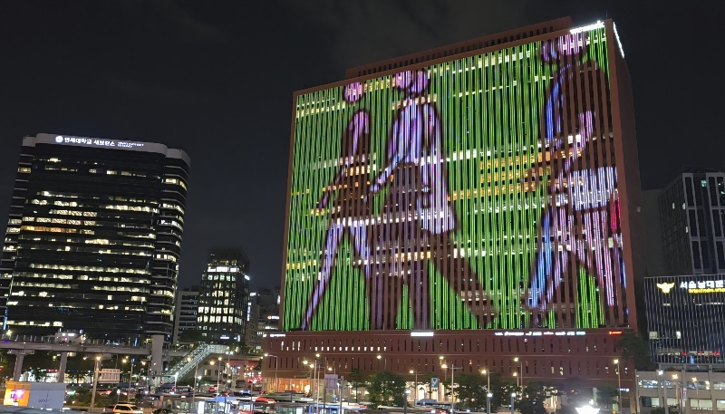 밤이 되면 거대한 캔버스로 변모하며, 포스트 팝 아티스트 줄리언 오피(Julian Opie)의 상징적인 작품 '걷는 사람들(Walking People)'이 살아 움직이는 거대한 미디어아트로 우리를 압도합니다.